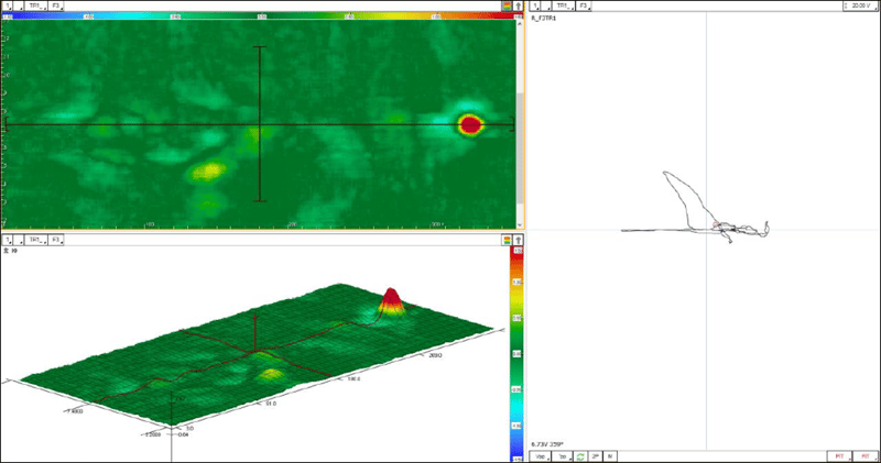 In such ideal conditions, the detection of very small defects becomes possible. Here’s the ECA results on a 0.25 mm (0.01 in) subsurface porosity, in a titanium orbital weld.